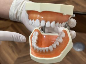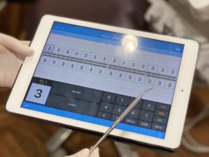 歯と歯茎の間にある歯周ポケットをメモリのついた器具で計測していきます。少しチクチクします。