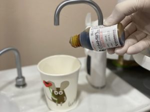 診察台にお座りいただき、感染症予防の為うがいをしていただきます。